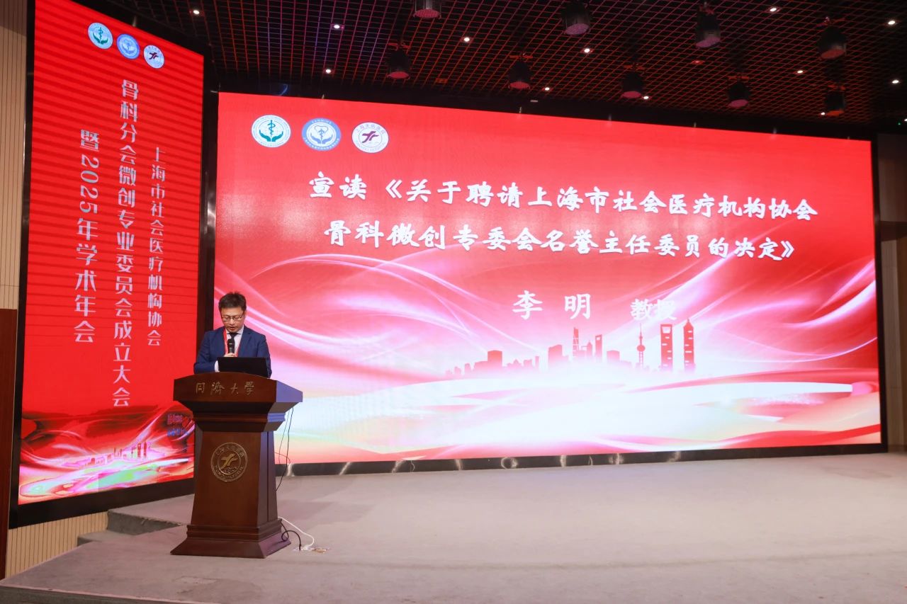 上海市社會醫(yī)療機構協(xié)會骨科分會李明會長宣讀《關于聘請上海市社會醫(yī)療機構協(xié)會骨科微創(chuàng)專委會名譽主任委員的決定》。蘇佳燦、王志偉、葉曉健、張秋林、郭龍當選名譽主任委員。