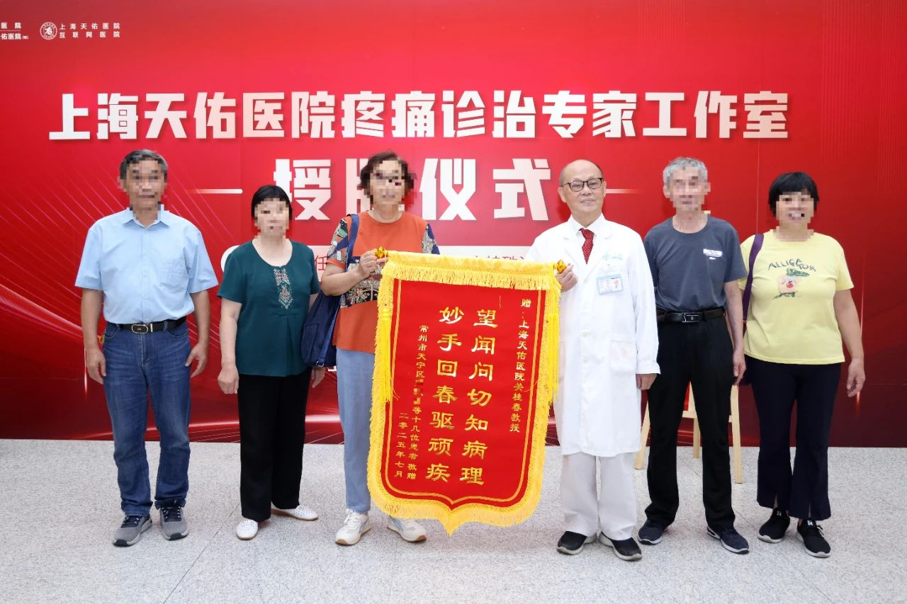 儀式當天上午正是關(guān)教授坐診時間。數(shù)名來自江蘇常州的患者特地組團向關(guān)教授贈送了錦旗。據(jù)了解,這些患者多年來遭受著頸肩腰腿關(guān)節(jié)痛折磨,經(jīng)關(guān)教授診治后獲得顯著改善,讓他們心存感激。聽說今天為關(guān)教授門診授牌時,他們特地趕制了錦旗,“望聞問切知病理,妙手回春驅(qū)頑疾”真實表達了他們的心聲。
