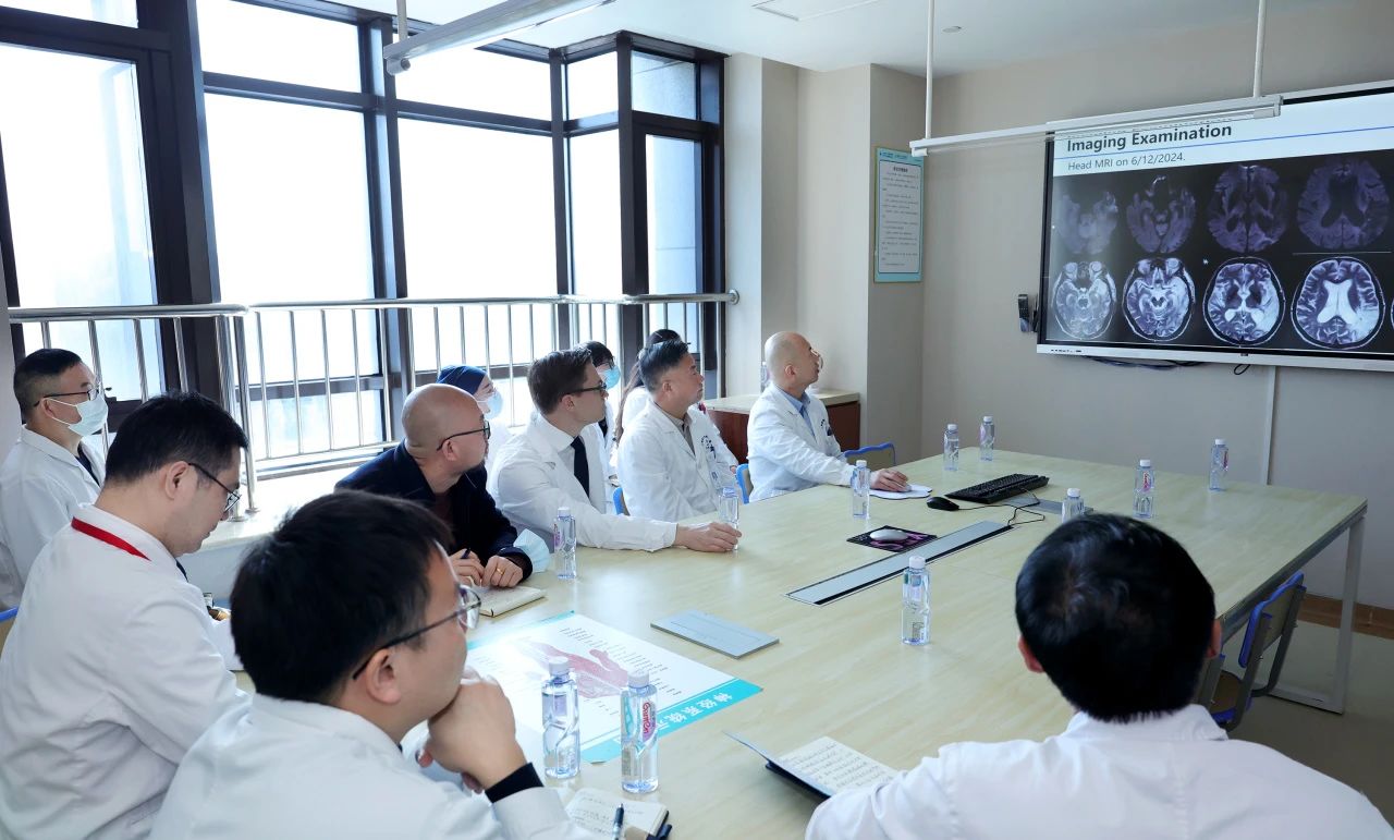 此外,圍繞患者圍手術期管理、DeepSeek及AI醫(yī)療技術在神經(jīng)外科領域的應用前景等熱點話題,雙方還開展了深入探討。與此同時, Sean P.Polster博士在副院長潘耀良等陪同下,來到4A腦血管病一科,與學術副院長兼4F主任席剛明教授,4A腦血管病一科副主任王貴平博士以及科室醫(yī)療骨干共同參加查房和討論。