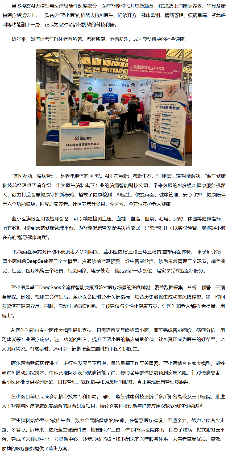 當(dāng)多模態(tài)AI大模型與醫(yī)療級(jí)硬件深度融合,醫(yī)療智能時(shí)代開啟新篇章。在2025上海國(guó)際養(yǎng)老、輔具及康復(fù)醫(yī)療博覽會(huì)上,一款名為“藍(lán)小醫(yī)”的機(jī)器人將AI醫(yī)生、問診開方、健康監(jiān)測(cè)、慢病管理、疾病早篩、緊急呼叫等功能融于一身,正成為應(yīng)對(duì)老齡化挑戰(zhàn)的科技利器。