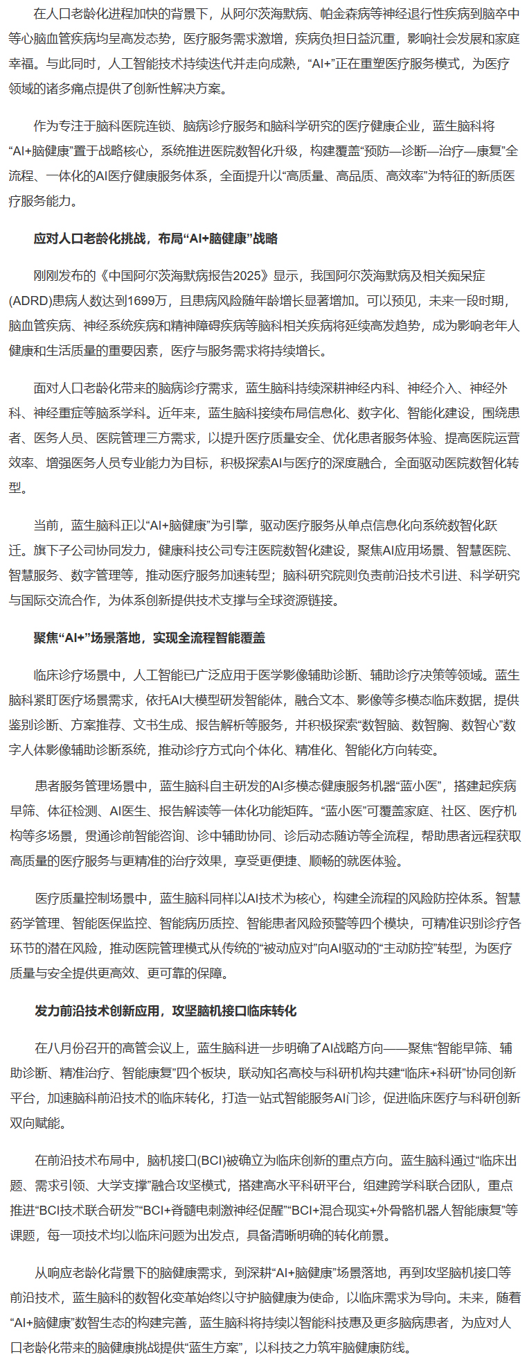 在人口老齡化進(jìn)程加快的背景下,從阿爾茨海默病、帕金森病等神經(jīng)退行性疾病到腦卒中等心腦血管疾病均呈高發(fā)態(tài)勢,醫(yī)療服務(wù)需求激增,疾病負(fù)擔(dān)日益沉重,影響社會發(fā)展和家庭幸福。與此同時,人工智能技術(shù)持續(xù)迭代并走向成熟,“AI+”正在重塑醫(yī)療服務(wù)模式,為醫(yī)療領(lǐng)域的諸多痛點提供了創(chuàng)新性解決方案。