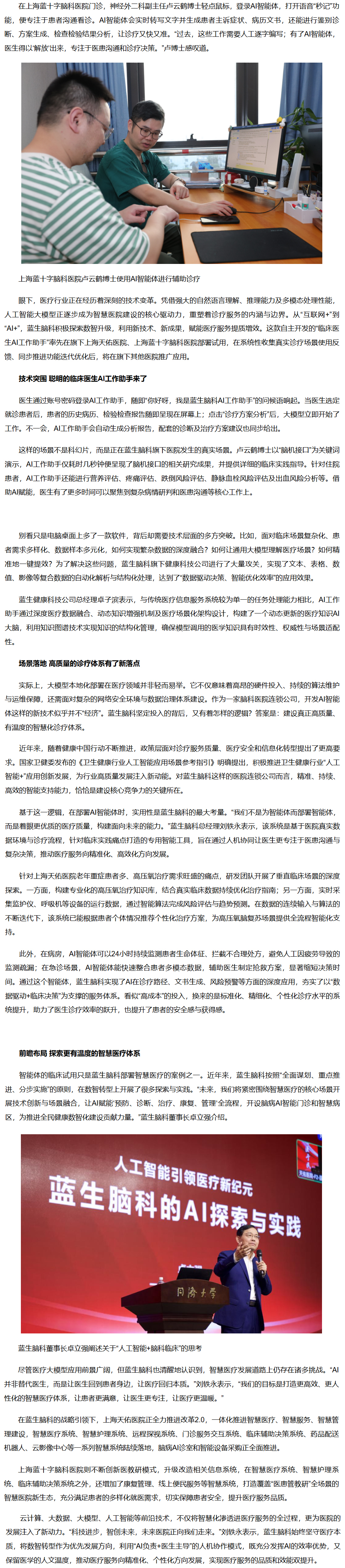 在上海藍(lán)十字腦科醫(yī)院門診,神經(jīng)外二科副主任盧云鶴博士輕點(diǎn)鼠標(biāo),登錄AI智能體,打開語音“秒記”功能,便專注于患者溝通看診。AI智能體會實(shí)時(shí)轉(zhuǎn)寫文字并生成患者主訴癥狀、病歷文書,還能進(jìn)行鑒別診斷、方案生成、檢查檢驗(yàn)結(jié)果分析,讓診療又快又準(zhǔn)。“過去,這些工作需要人工逐字編寫;有了AI智能體,醫(yī)生得以‘解放’出來,專注于醫(yī)患溝通和診療決策。”盧博士感嘆道。