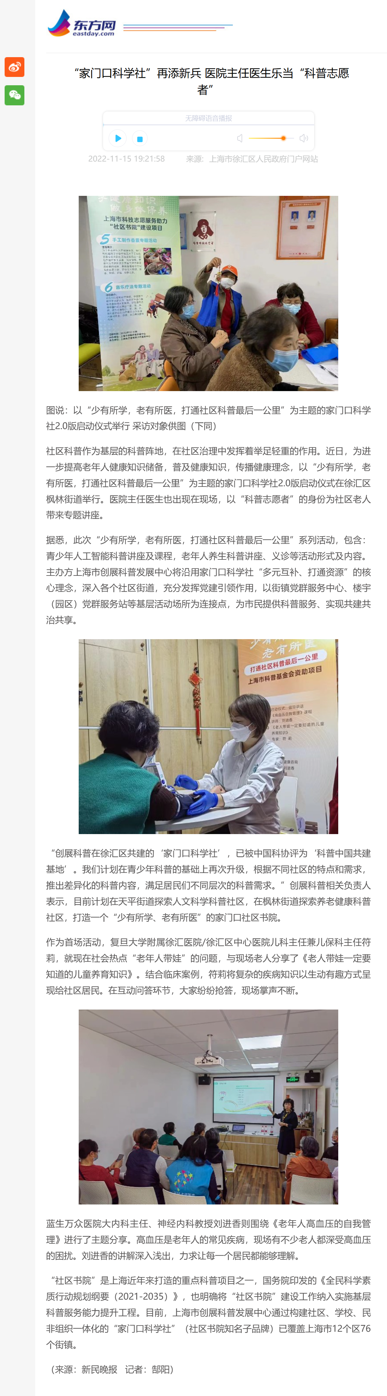 社區(qū)科普作為基層的科普陣地,在社區(qū)治理中發(fā)揮著舉足輕重的作用。近日,為進(jìn)一步提高老年人健康知識(shí)儲(chǔ)備,普及健康知識(shí),傳播健康理念,以“少有所學(xué),老有所醫(yī),打通社區(qū)科普最后一公里”為主題的家門(mén)口科學(xué)社2.0版啟動(dòng)儀式在徐匯區(qū)楓林街道舉行。