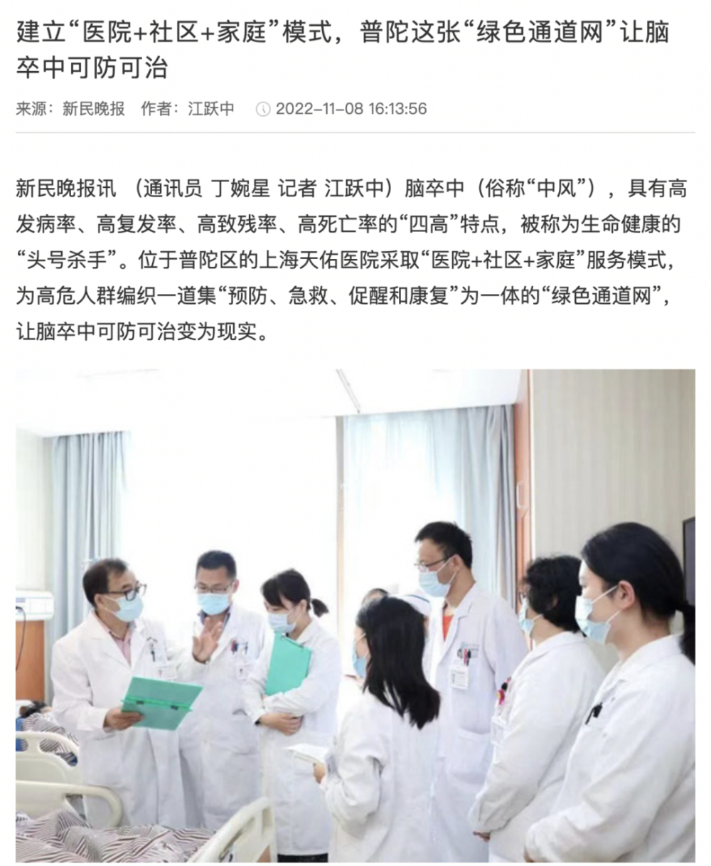 腦卒中(俗稱“中風”),具有高發(fā)病率、高復發(fā)率、高致殘率、高死亡率的“四高”特點,被稱為生命健康的“頭號殺手”。數(shù)據(jù)顯示,腦卒中的發(fā)病率逐年攀升,并且呈現(xiàn)了低齡化的趨勢。位于普陀區(qū)的上海天佑醫(yī)院采取“醫(yī)院+社區(qū)+家庭”服務模式,為高危人群編織一道集“預防、急救、促醒和康復”為一體的“綠色通道網(wǎng)”,讓腦卒中可防可治變?yōu)楝F(xiàn)實。