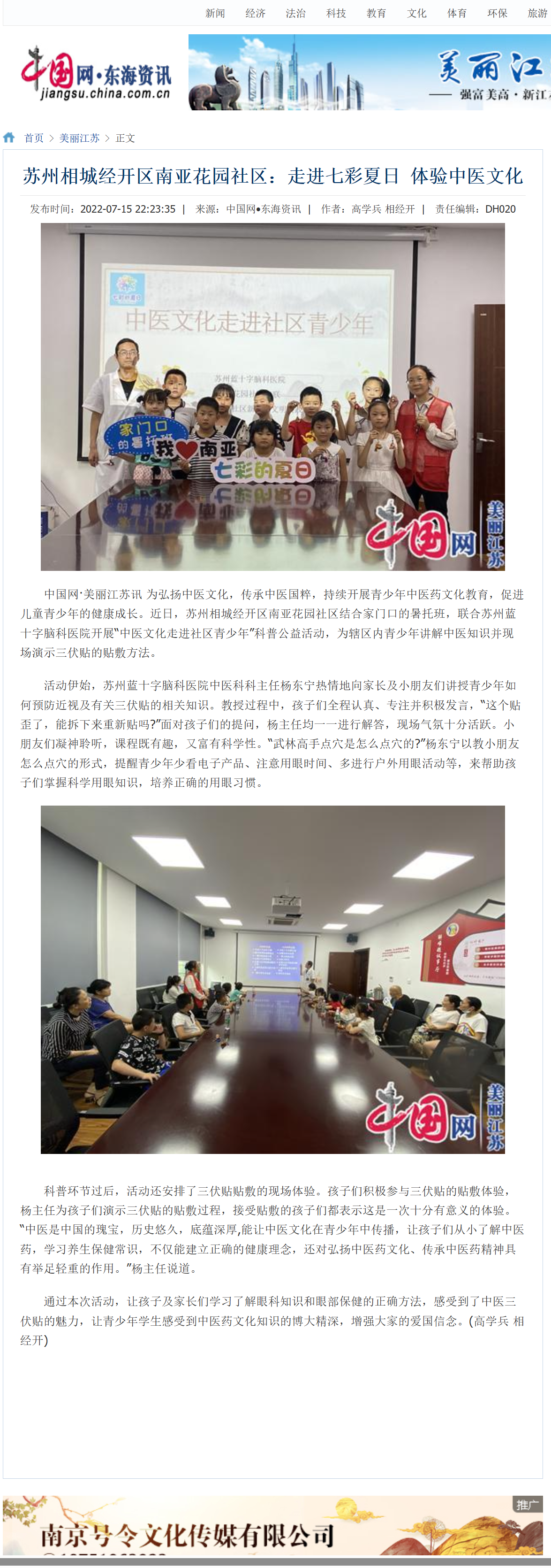 中國網(wǎng)·美麗江蘇訊 為弘揚中醫(yī)文化,傳承中醫(yī)國粹,持續(xù)開展青少年中醫(yī)藥文化教育,促進兒童青少年的健康成長。近日,蘇州相城經(jīng)開區(qū)南亞花園社區(qū)結合家門口的暑托班,聯(lián)合蘇州藍十字腦科醫(yī)院開展“中醫(yī)文化走進社區(qū)青少年”科普公益活動,為轄區(qū)內(nèi)青少年講解中醫(yī)知識并現(xiàn)場演示三伏貼的貼敷方法。