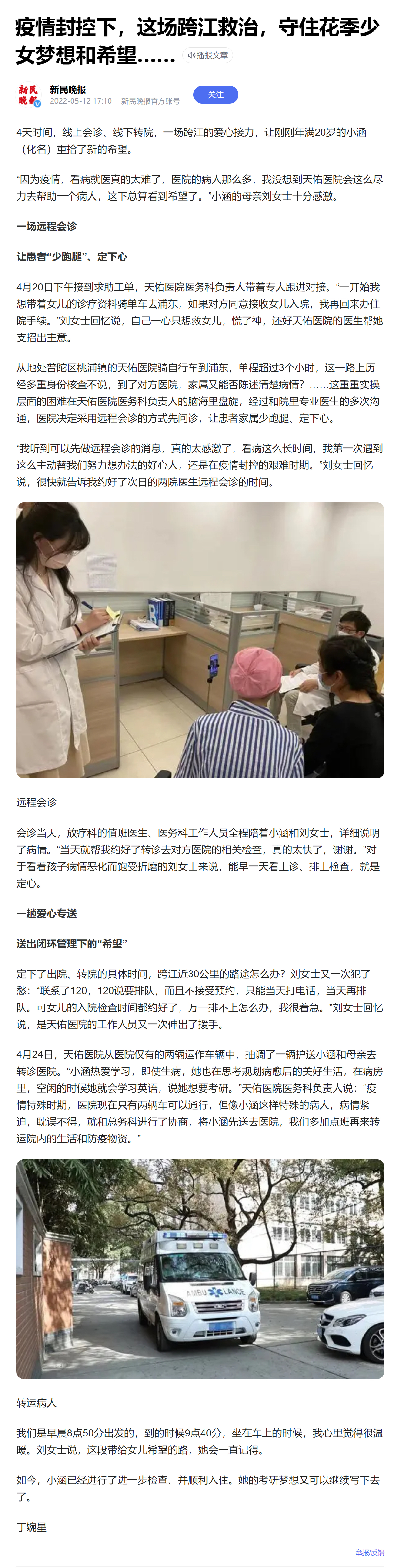 新民晚報:這場跨江救治,守住花季少女夢想和希望