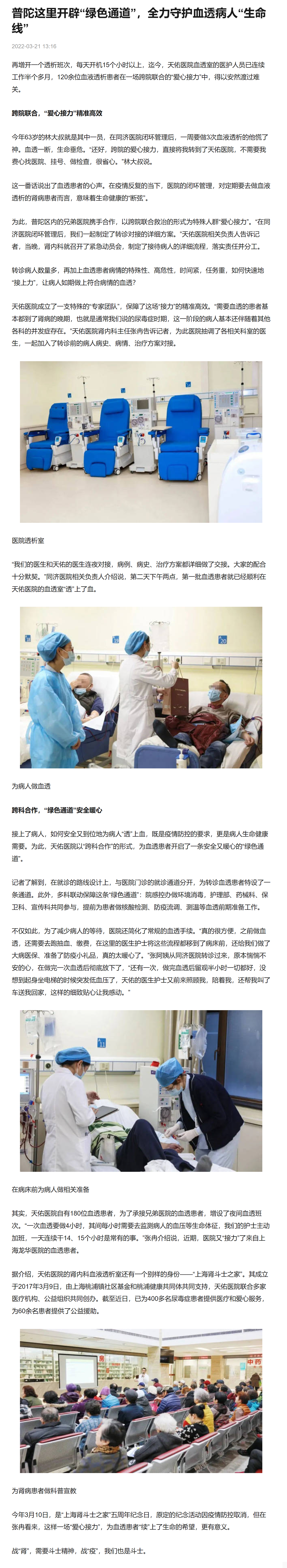 再增開一個透析班次,每天開機15個小時以上,迄今,上海天佑醫(yī)院血透室的醫(yī)護人員已連續(xù)工作半個多月,120余位血液透析患者在一場跨院聯合的“愛心接力”中,得以安然渡過難關。