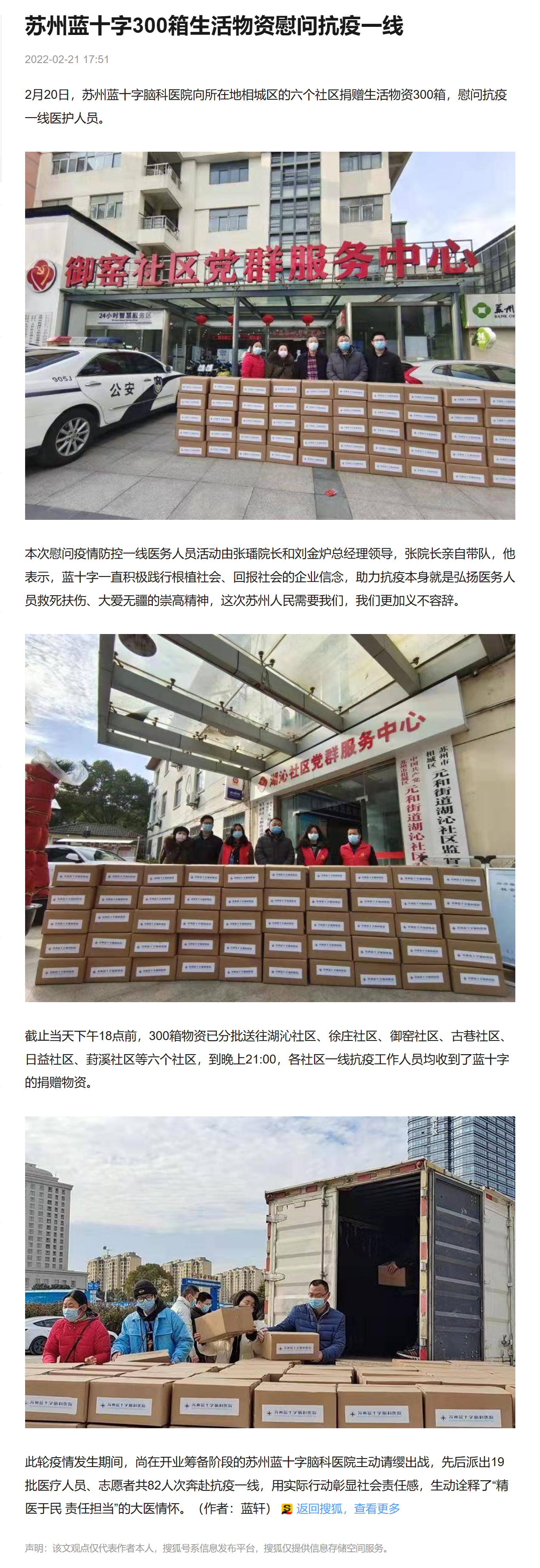 2月20日,蘇州藍十字腦科醫(yī)院向所在地相城區(qū)的六個社區(qū)捐贈生活物資300箱,慰問抗疫一線醫(yī)護人員。