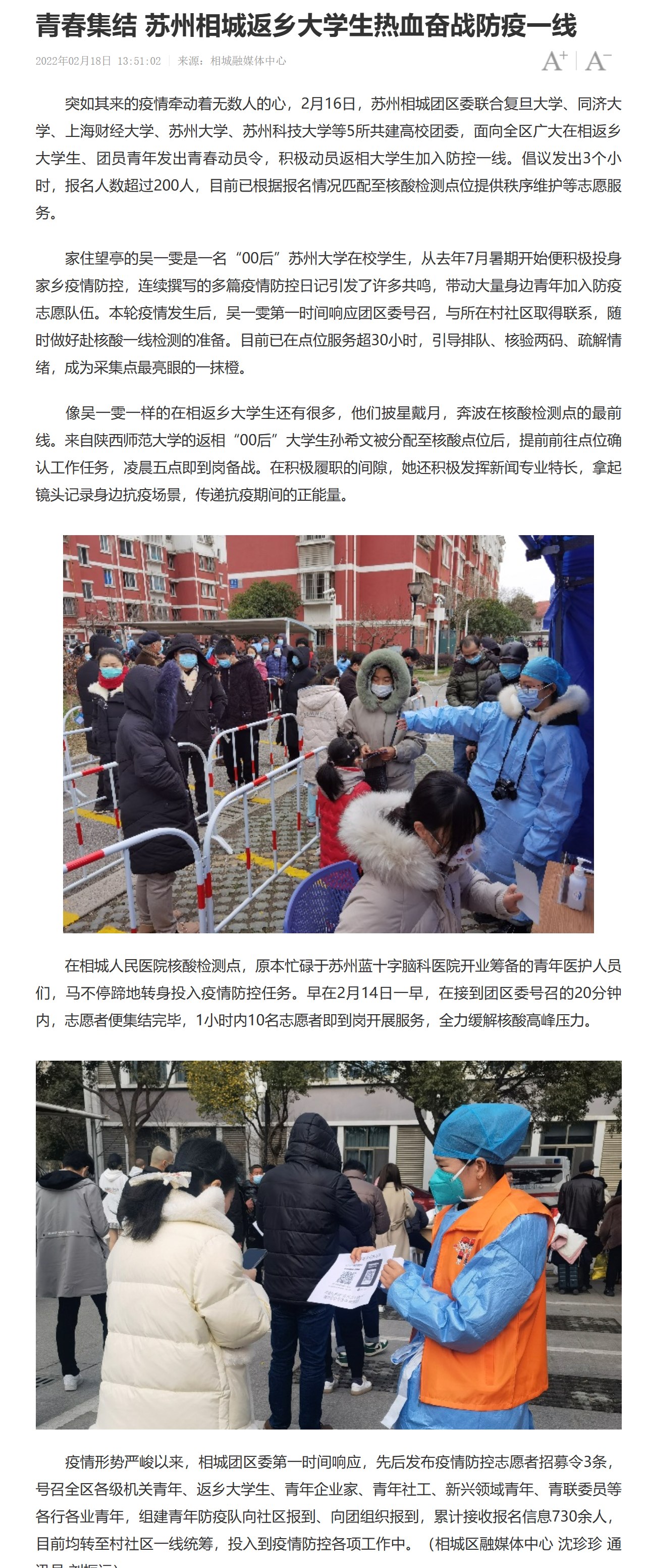突如其來的疫情牽動著無數(shù)人的心,2月16日,蘇州相城團(tuán)區(qū)委聯(lián)合復(fù)旦大學(xué)、同濟(jì)大學(xué)、上海財經(jīng)大學(xué)、蘇州大學(xué)、蘇州科技大學(xué)等5所共建高校團(tuán)委,面向全區(qū)廣大在相返鄉(xiāng)大學(xué)生、團(tuán)員青年發(fā)出青春動員令,積極動員返相大學(xué)生加入防控一線。倡議發(fā)出3個小時,報名人數(shù)超過200人,目前已根據(jù)報名情況匹配至核酸檢測點位提供秩序維護(hù)等志愿服務(wù)。