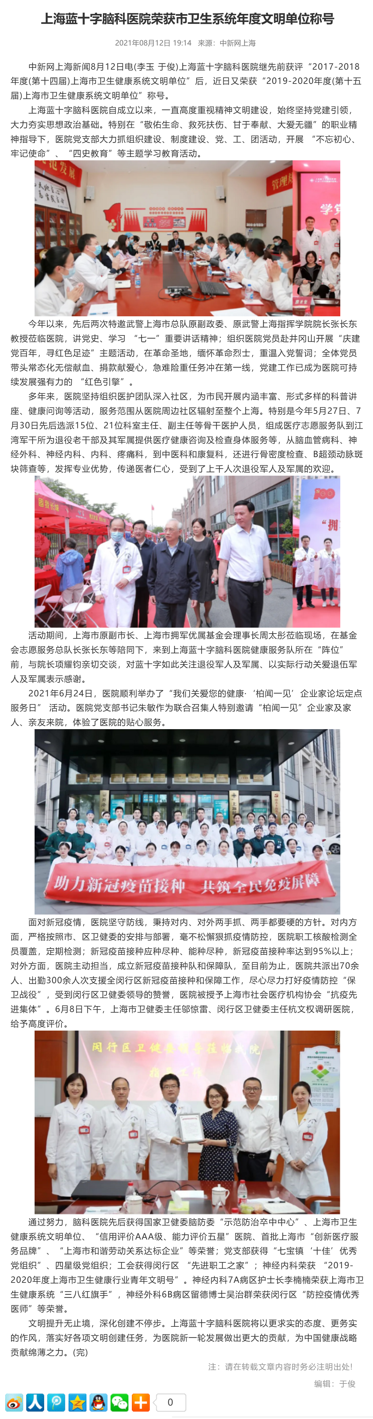 中新網(wǎng)上海新聞8月12日電(李玉 于俊)上海藍十字腦科醫(yī)院繼先前獲評“2017-2018年度(第十四屆)上海市衛(wèi)生健康系統(tǒng)文明單位”后,近日又榮獲“2019-2020年度(第十五屆)上海市衛(wèi)生健康系統(tǒng)文明單位”稱號。