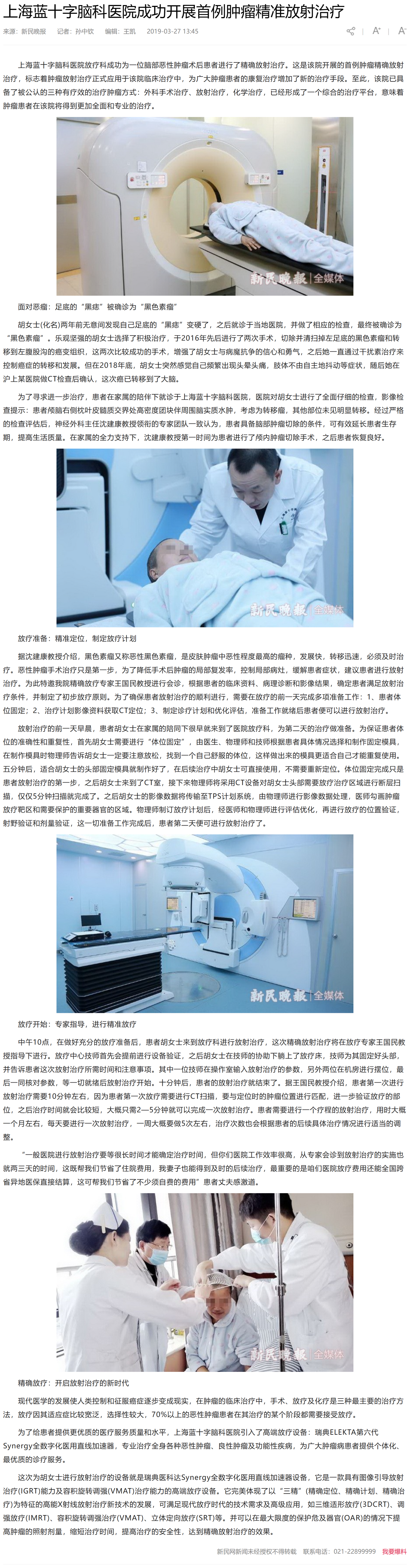 上海藍(lán)十字腦科醫(yī)院放療科成功為一位腦部惡性腫瘤術(shù)后患者進(jìn)行了精確放射治療。這是該院開展的首例腫瘤精確放射治療,標(biāo)志著腫瘤放射治療正式應(yīng)用于該院臨床治療中,為廣大腫瘤患者的康復(fù)治療增加了新的治療手段。至此,該院已具備了被公認(rèn)的三種有療效的治療腫瘤方式:外科手術(shù)治療、放射治療,化學(xué)治療,已經(jīng)形成了一個(gè)綜合的治療平臺(tái),意味著腫瘤患者在該院將得到更加全面和專業(yè)的治療。