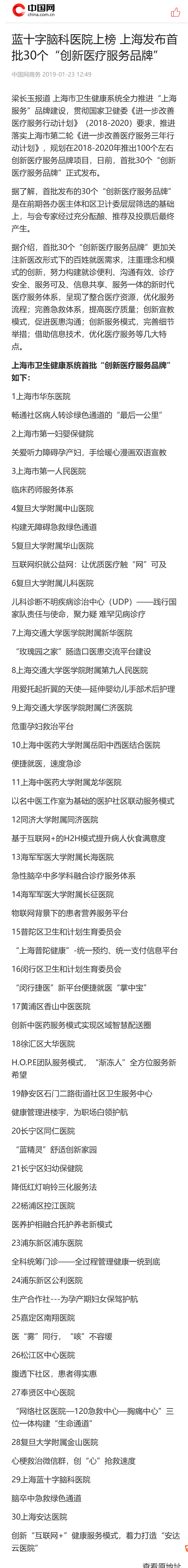梁長(zhǎng)玉報(bào)道 上海市衛(wèi)生健康系統(tǒng)全力推進(jìn)“上海服務(wù)”品牌建設(shè),貫徹國(guó)家衛(wèi)健委《進(jìn)一步改善醫(yī)療服務(wù)行動(dòng)計(jì)劃》(2018-2020)要求,推進(jìn)落實(shí)上海市第二輪《進(jìn)一步改善醫(yī)療服務(wù)三年行動(dòng)計(jì)劃》,規(guī)劃在2018-2020年推出100個(gè)左右創(chuàng)新醫(yī)療服務(wù)品牌項(xiàng)目,日前,首批30個(gè)“創(chuàng)新醫(yī)療服務(wù)品牌”正式發(fā)布。