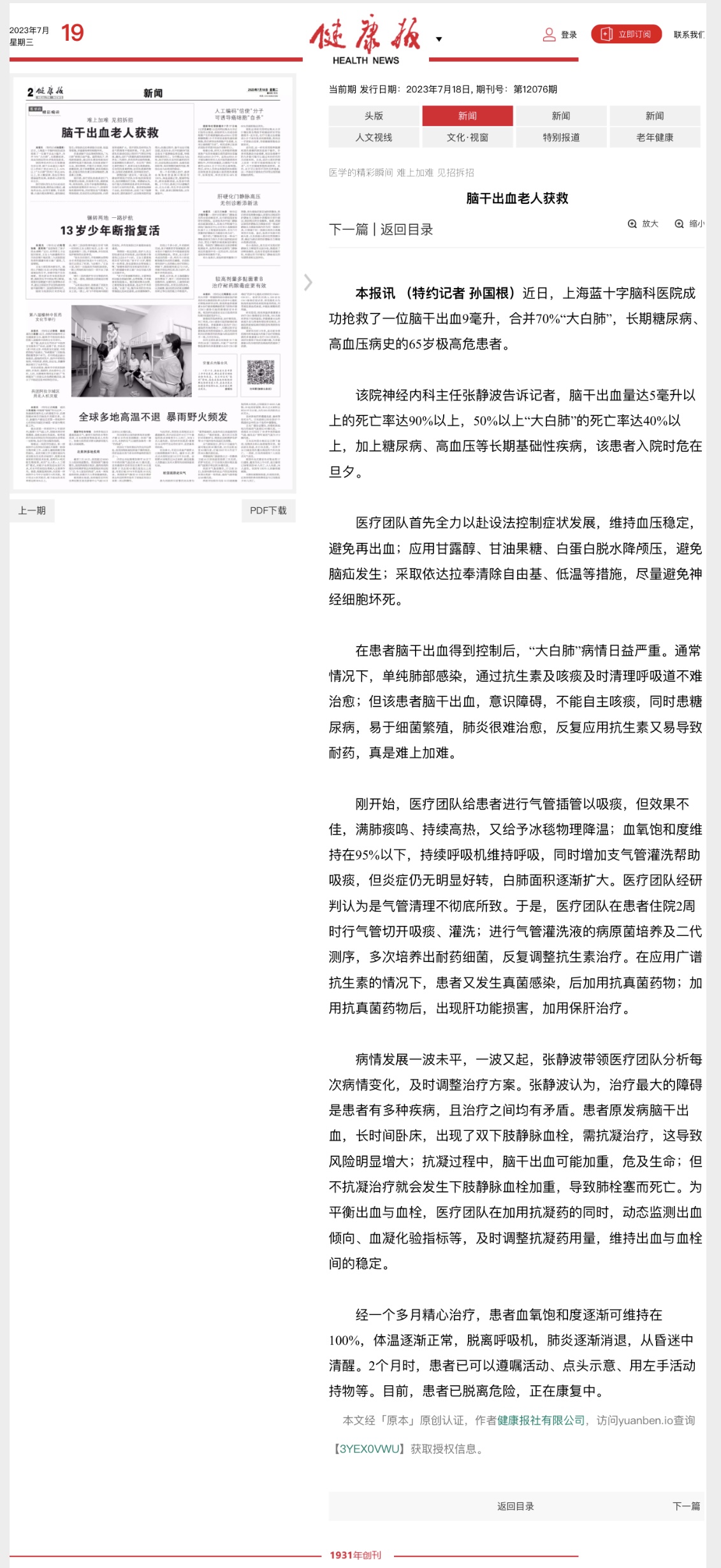 本報訊 (特約記者 孫國根)近日,上海藍十字腦科醫(yī)院成功搶救了一位腦干出血9毫升,合并70%“大白肺”,長期糖尿病、高血壓病史的65歲極高?;颊?。http://jkbshare.183read.cc/article/4970670/5.html