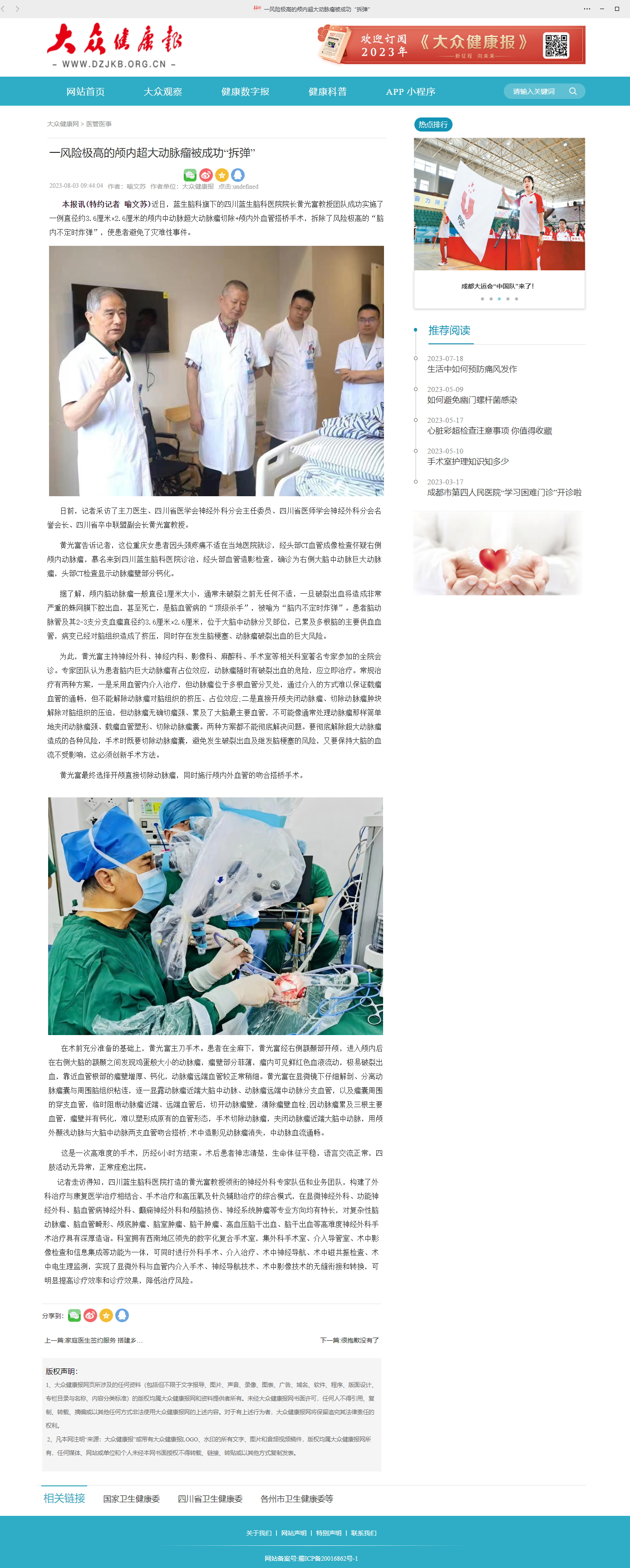 本報(bào)訊(特約記者 喻文蘇)近日,藍(lán)生腦科旗下的四川藍(lán)生腦科醫(yī)院院長黃光富教授團(tuán)隊(duì)成功實(shí)施一例直徑約3.6厘米x2.6厘米的頗內(nèi)中動脈超大動脈瘤切除+顱內(nèi)外血管搭橋手術(shù),拆除了風(fēng)險(xiǎn)極高的“”,使患者避免了災(zāi)難性事件