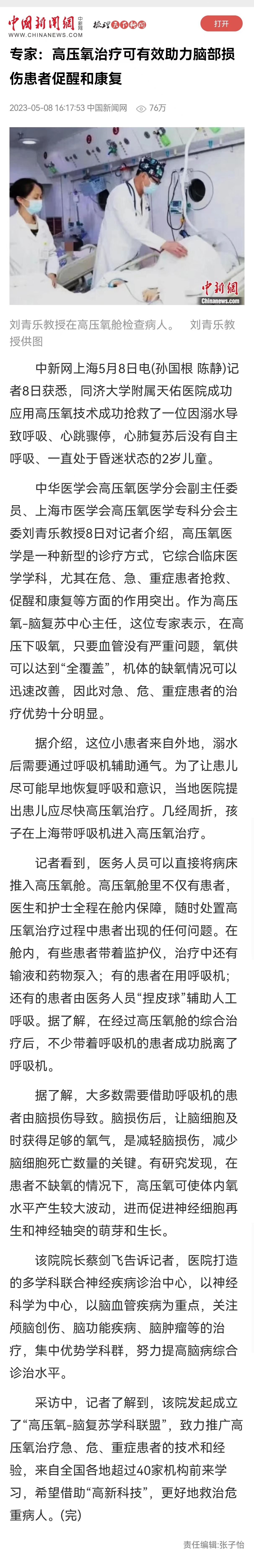中新網(wǎng)上海5月8日電(孫國根 陳靜)記者8日獲悉,同濟大學附屬天佑醫(yī)院成功應(yīng)用高壓氧技術(shù)成功搶救了一位因溺水導致呼吸、心跳驟停,心肺復(fù)蘇后沒有自主呼吸、一直處于昏迷狀態(tài)的2歲兒童。