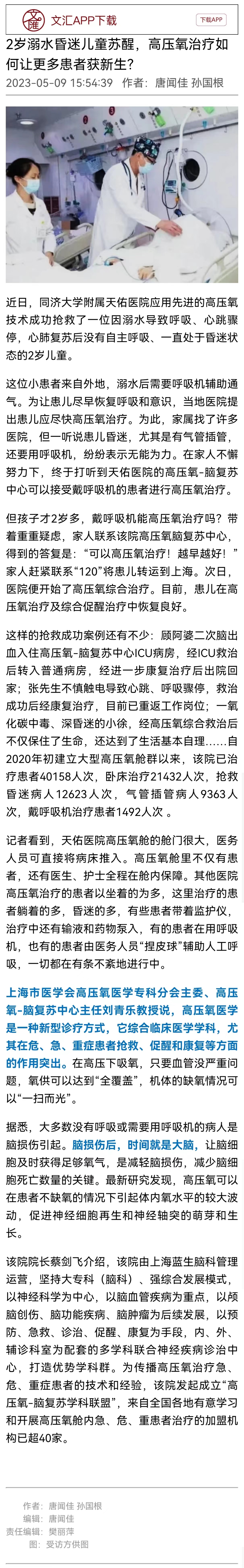 近日,同濟(jì)大學(xué)附屬天佑醫(yī)院應(yīng)用先進(jìn)的高壓氧技術(shù)成功搶救了一位因溺水導(dǎo)致呼吸、心跳驟停,心肺復(fù)蘇后沒有自主呼吸、一直處于昏迷狀態(tài)的2歲兒童。