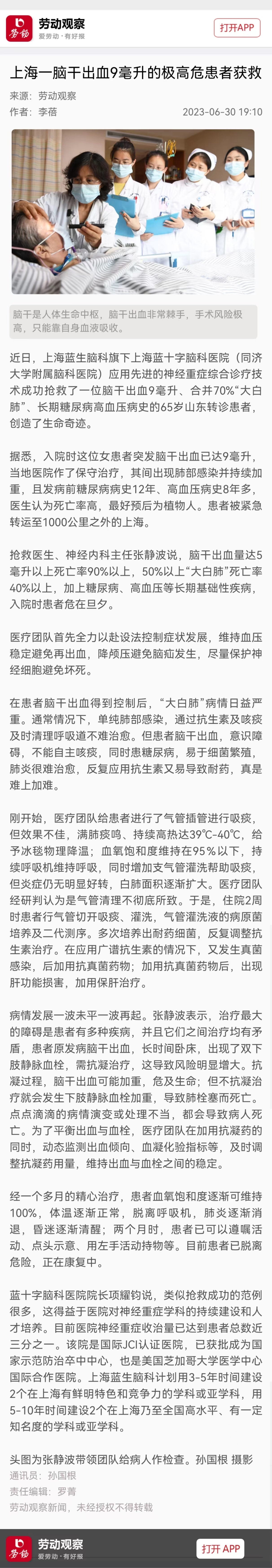 近日,上海藍(lán)生腦科旗下上海藍(lán)十字腦科醫(yī)院(同濟(jì)大學(xué)附屬腦科醫(yī)院)應(yīng)用先進(jìn)的神經(jīng)重癥綜合診療技術(shù)成功搶救了一位腦干出血9毫升、合并70%“大白肺”、長(zhǎng)期糖尿病高血壓病史的65歲山東轉(zhuǎn)診患者,創(chuàng)造了生命奇跡。