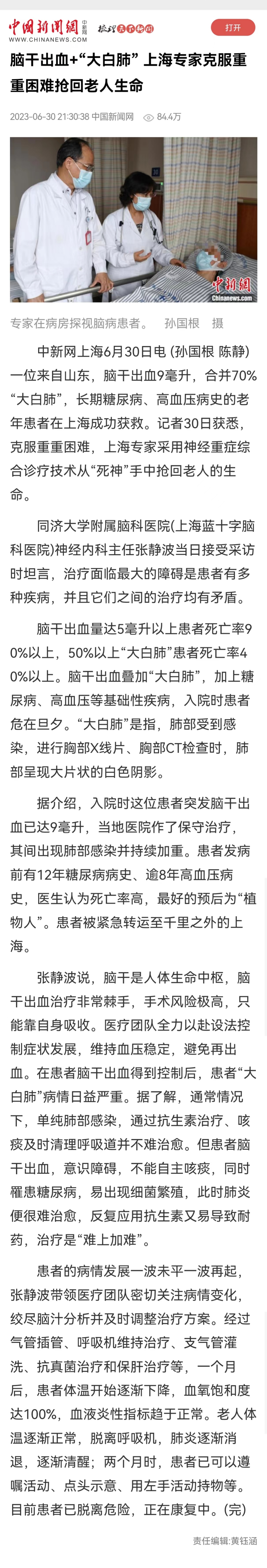中新網(wǎng)上海6月30日電 (孫國(guó)根 陳靜)一位來(lái)自山東,腦干出血9毫升,合并70%“大白肺”,長(zhǎng)期糖尿病、高血壓病史的老年患者在上海成功獲救。記者30日獲悉,克服重重困難,上海專家采用神經(jīng)重癥綜合診療技術(shù)從“死神”手中搶回老人的生命。