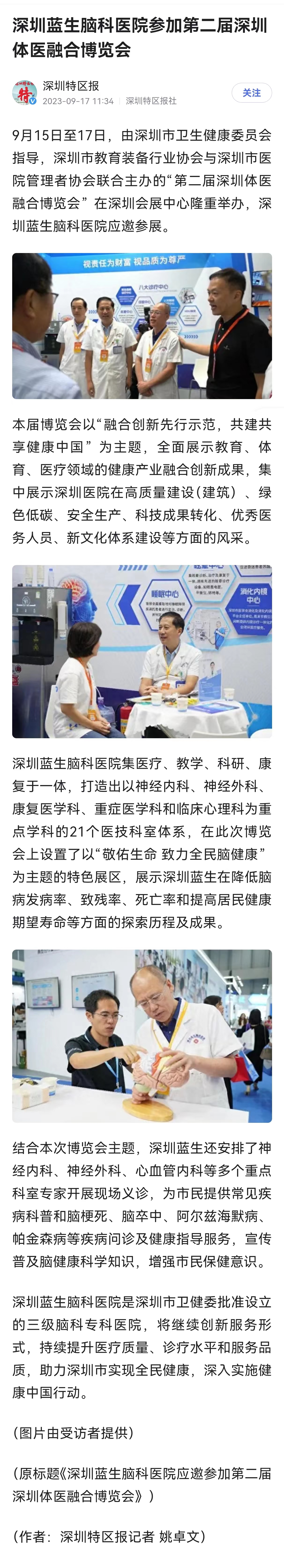 9月15日至17日,由深圳市衛(wèi)生健康委員會指導,深圳市教育裝備行業(yè)協(xié)會與深圳市醫(yī)院管理者協(xié)會聯合主辦的“第二屆深圳體醫(yī)融合博覽會”在深圳會展中心隆重舉辦,深圳藍生腦科醫(yī)院應邀參展。