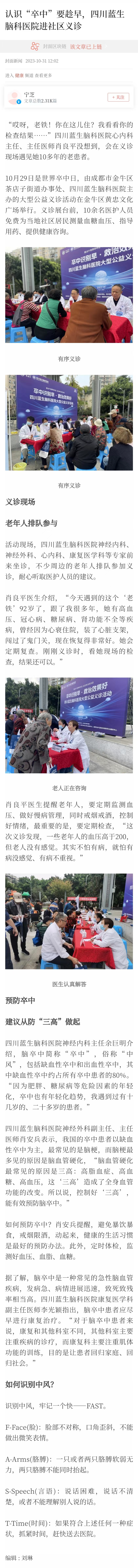 10月29日是世界卒中日,由成都市金牛區(qū)茶店子街道辦事處、四川藍(lán)生腦科醫(yī)院主辦的大型公益義診活動(dòng)在金牛區(qū)黃忠文化廣場舉行。義診展臺(tái)前,10余名醫(yī)護(hù)人員免費(fèi)為當(dāng)?shù)厣鐓^(qū)居民測量血糖血壓、指導(dǎo)用藥、提供健康咨詢。