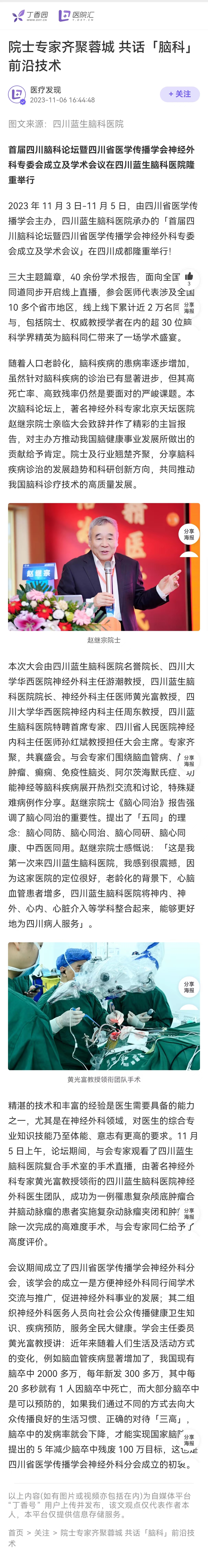 2023 年 11 月 3 日-11 月 5 日,由四川省醫(yī)學(xué)傳播學(xué)會(huì)主辦,四川藍(lán)生腦科醫(yī)院承辦的「首屆四川腦科論壇暨四川省醫(yī)學(xué)傳播學(xué)會(huì)神經(jīng)外科專委會(huì)成立及學(xué)術(shù)會(huì)議」在四川成都隆重舉行!