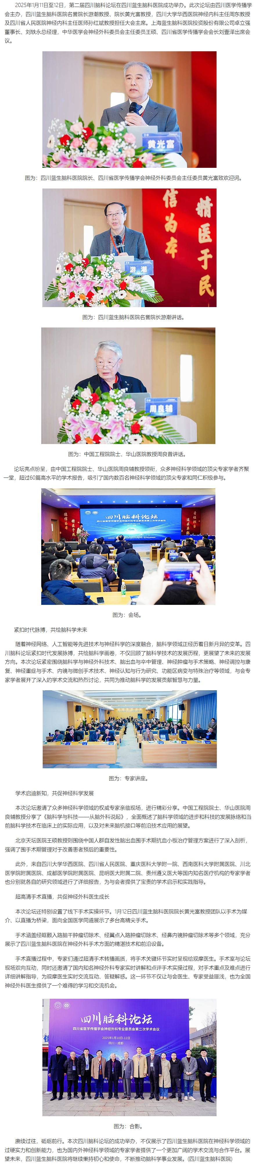 2025年1月11日至12日,第二屆四川腦科論壇在四川藍(lán)生腦科醫(yī)院成功舉辦。此次論壇由四川醫(yī)學(xué)傳播學(xué)會(huì)主辦,四川藍(lán)生腦科醫(yī)院名譽(yù)院長(zhǎng)游潮教授、院長(zhǎng)黃光富教授,四川大學(xué)華西醫(yī)院神經(jīng)內(nèi)科主任周東教授及四川省人民醫(yī)院神經(jīng)內(nèi)科主任醫(yī)師孫紅斌教授擔(dān)任大會(huì)主席。上海藍(lán)生腦科醫(yī)院投資股份有限公司卓立強(qiáng)董事長(zhǎng)、劉軼永總經(jīng)理,中華醫(yī)學(xué)會(huì)神經(jīng)外科委員會(huì)主任委員王碩、四川省醫(yī)學(xué)傳播學(xué)會(huì)會(huì)長(zhǎng)劉壹澤出席會(huì)議。