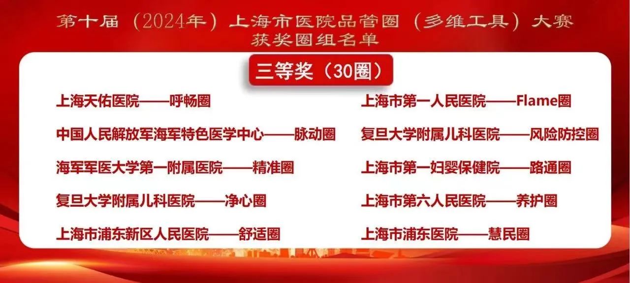 中秋佳節(jié)前夕,上海天佑醫(yī)院在國家級(jí)和上海市級(jí)改善護(hù)理服務(wù)及品質(zhì)管理比賽中接連獲獎(jiǎng)。8月29日,由上海市衛(wèi)生健康委員會(huì)醫(yī)政醫(yī)管處指導(dǎo)、上海市醫(yī)院協(xié)會(huì)主辦的第十屆(2024年)上海市醫(yī)院品管圈(多維工具)大賽順利舉辦。經(jīng)過激烈角逐,上海天佑醫(yī)院選送的“呼暢圈”以優(yōu)異表現(xiàn)入圍決賽,并榮獲大賽三等獎(jiǎng)。據(jù)悉,上海天佑醫(yī)院獲得了國家級(jí)參賽資格。