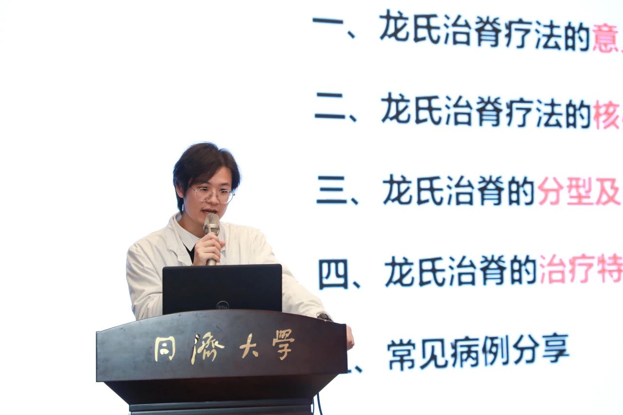 “龍氏治脊療法起源于20世紀(jì)末,由魏征、龍層花教授創(chuàng)立,是融合經(jīng)絡(luò)學(xué)、解剖學(xué)及生物力學(xué)的一門特殊的脊椎疾病的治療技術(shù),它強(qiáng)調(diào)脊柱、關(guān)節(jié)異??捎绊懭砉δ?。”天佑醫(yī)院康復(fù)科主管治療師黃濤以《頸椎病的龍氏治療》為題,講述了龍氏治脊療法的核心技術(shù)以及龍氏治脊的分型及手法特色、治療特點(diǎn),并分享了龍氏治脊三步定位診斷法,即神經(jīng)定位診斷、觸診定位診斷、影像學(xué)定位診斷。他強(qiáng)調(diào),龍氏治脊療法的精髓在于“動中求正”,手法特色在于穩(wěn)定且準(zhǔn)確、軟硬結(jié)合。