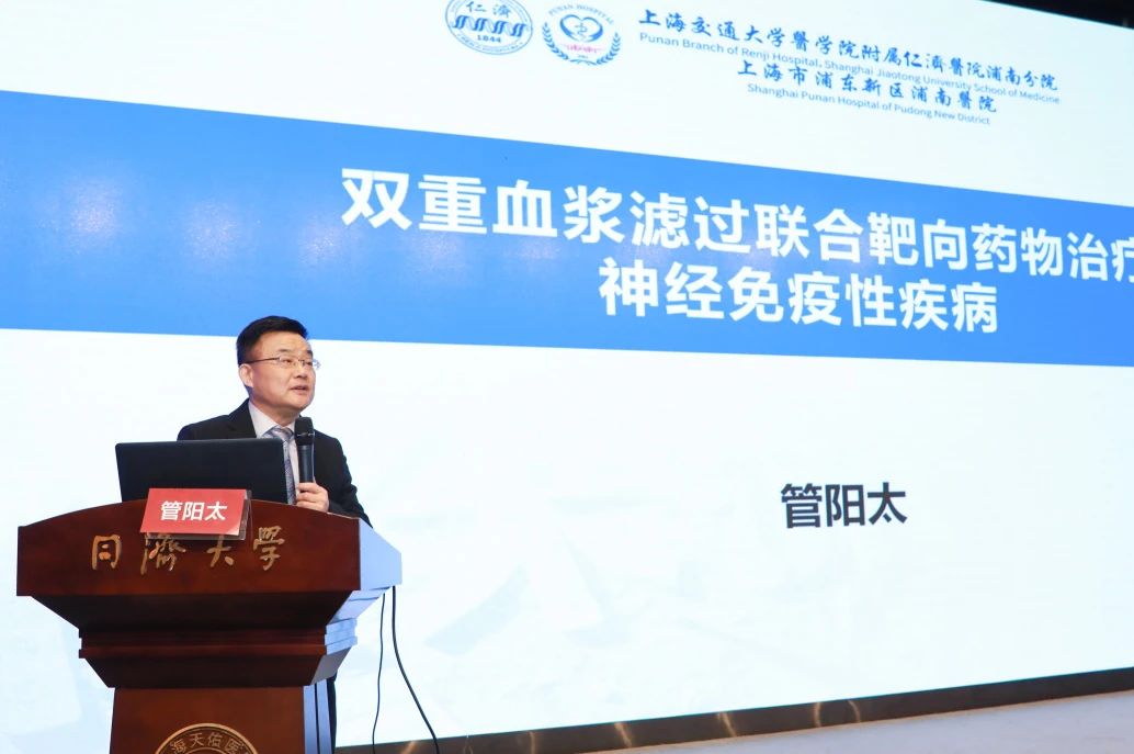 神經(jīng)病學(xué)分會(huì)主任委員、上海交通大學(xué)醫(yī)學(xué)院附屬仁濟(jì)醫(yī)院神經(jīng)內(nèi)科主任管陽(yáng)太作《雙重血漿濾過(guò)聯(lián)合靶向藥物治療神經(jīng)免疫性疾病》專(zhuān)題講座,介紹了血漿置換的基本原理、臨床應(yīng)用及相關(guān)經(jīng)驗(yàn)等。