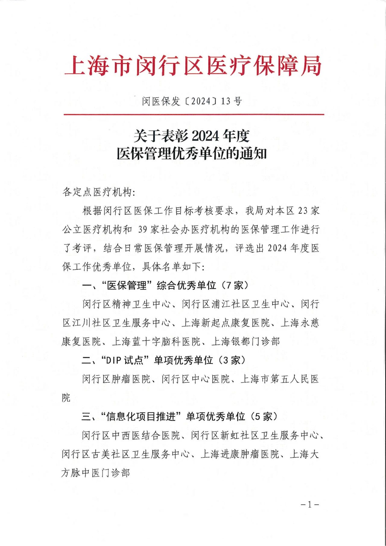 12月27日,上海市閔行區(qū)醫(yī)療保障局對2024年度醫(yī)保管理優(yōu)秀單位予以通報表彰。據(jù)閔行區(qū)醫(yī)療保障局《關(guān)于表彰 2024年度醫(yī)保管理優(yōu)秀單位的通知》(閔醫(yī)保發(fā)【2024】13號),區(qū)醫(yī)保局根據(jù)醫(yī)保工作目標(biāo)考核要求,對閔行區(qū)23家公立醫(yī)療機(jī)構(gòu)和39家社會辦醫(yī)療機(jī)構(gòu)的醫(yī)保管理工作進(jìn)行了考評,結(jié)合日常醫(yī)保管理開展情況,最終評選出2024年度醫(yī)保工作優(yōu)秀單位。經(jīng)考評,上海藍(lán)十字腦科醫(yī)院與閔行區(qū)精神衛(wèi)生中心等7家單位,獲評“醫(yī)保管理”綜合優(yōu)秀單位榮譽稱號。