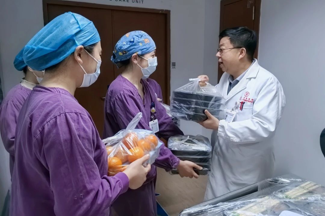 除夕夜6時許,上海天佑醫(yī)院蔡劍飛院長、孫凱副總經(jīng)理和行政后勤值班人員一起深入臨床一線,為堅守崗位的醫(yī)務人員送去了精心準備的年夜飯和水果,感謝醫(yī)護人員舍小家為大家的奉獻精神。每到一處,醫(yī)院領導都親切詢問值班人員的工作安排情況和住院病人情況,為他們送上祝福。食堂和營養(yǎng)科還特別為住院病人送去了水餃,專門為特需病人配制了營養(yǎng)餐。