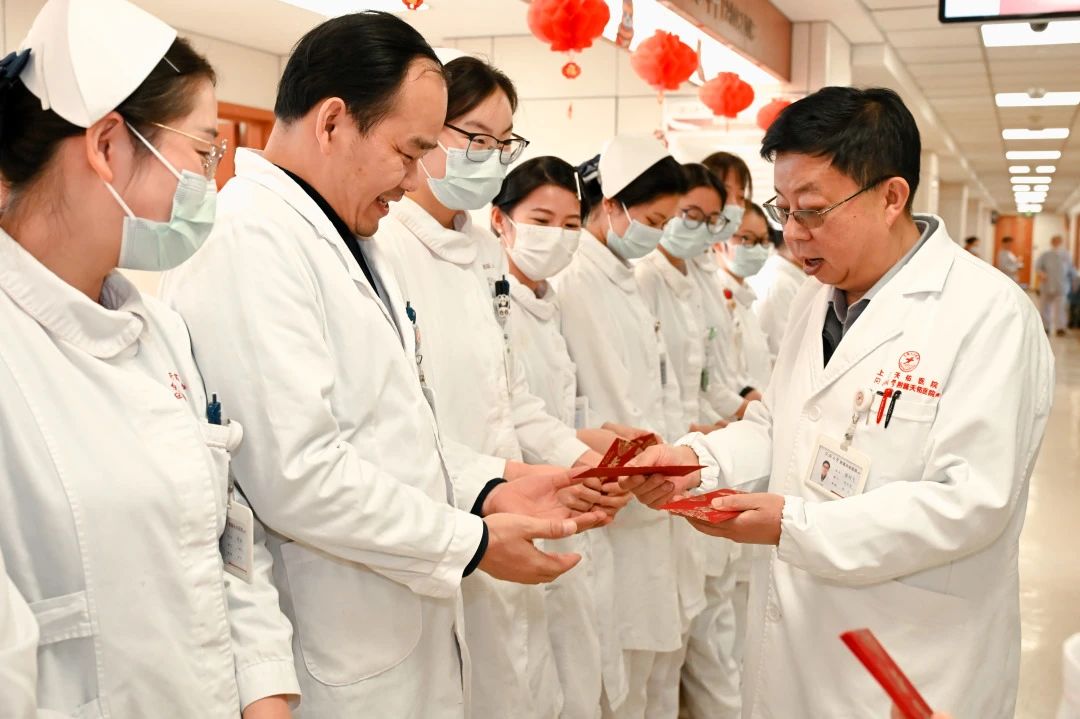 上海藍十字腦科醫(yī)院項耀鈞院長等領導攜行政總值班、護理總值班深入各科室各部門,親切慰問堅守崗位的醫(yī)護人員和后勤保障人員,向大家送上新春的祝福,并將承載著美好祝愿的新春紅包和慰問信送到大家手中。醫(yī)院領導帶著新春的祝福深入醫(yī)院各科室,親切看望慰問堅守崗位的工作人員。