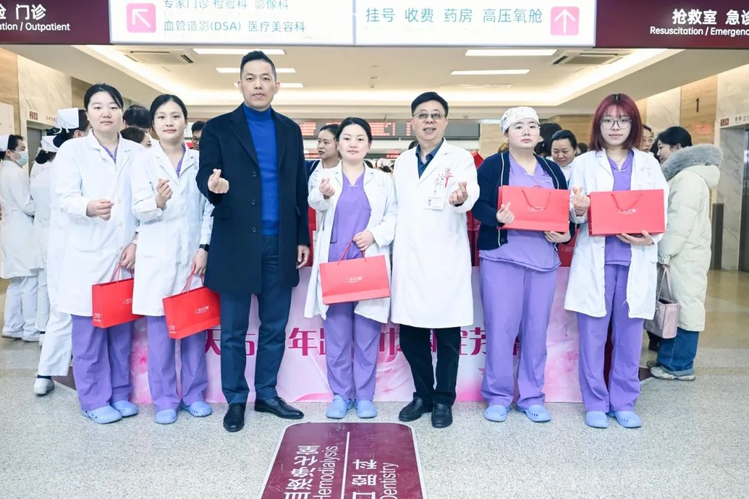 7日,上海天佑醫(yī)院領(lǐng)導(dǎo)一早便來到門診大廳,為女員工送上精心準備的節(jié)日禮物和祝福。醫(yī)院也收到了多位在院工作超過十年的女員工送來的祝福。