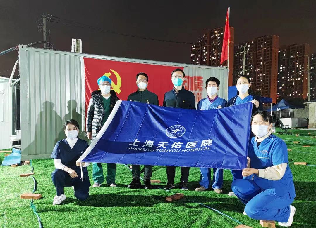 4月21日晚八點半,普陀區(qū)連亮路方艙醫(yī)院外場地上,黨旗在春天的夜空下飄揚,天佑醫(yī)院方艙醫(yī)療隊員們手托院旗,站在黨旗前準備接受一次“特殊的洗禮”——方艙醫(yī)院臨時黨支部正在為天佑醫(yī)療隊三位隊員舉辦“集體遞交入黨申請書”儀式。