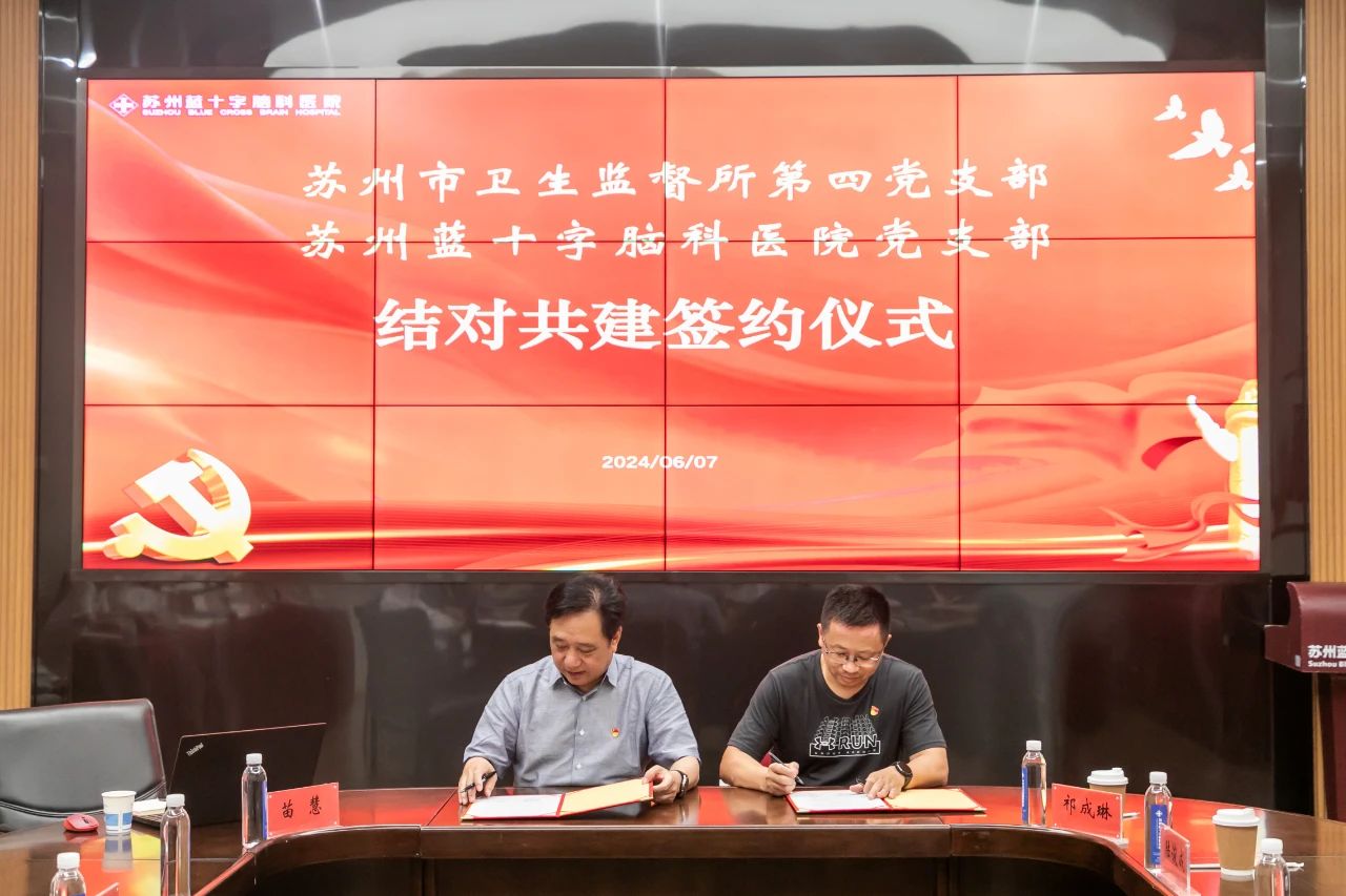 為深入貫徹落實習(xí)近平總書記關(guān)于黨的建設(shè)重要講話精神和指示要求,將新時代黨的建設(shè)總要求和新時代黨的組織路線落到實處,加強黨組織互融共進、優(yōu)勢互補,開創(chuàng)“黨建引領(lǐng)、凝聚共識、推動發(fā)展”的新格局,2024年6月7日,蘇州藍十字腦科醫(yī)院黨支部與蘇州市衛(wèi)生監(jiān)督所第四黨支部舉行“結(jié)對共建”簽約揭牌儀式,醫(yī)院黨支部書記徐必生同志及黨員代表,蘇州市衛(wèi)生監(jiān)督所副所長張家兵及成員代表,雙方相關(guān)部門負責(zé)同志參加簽約儀式。