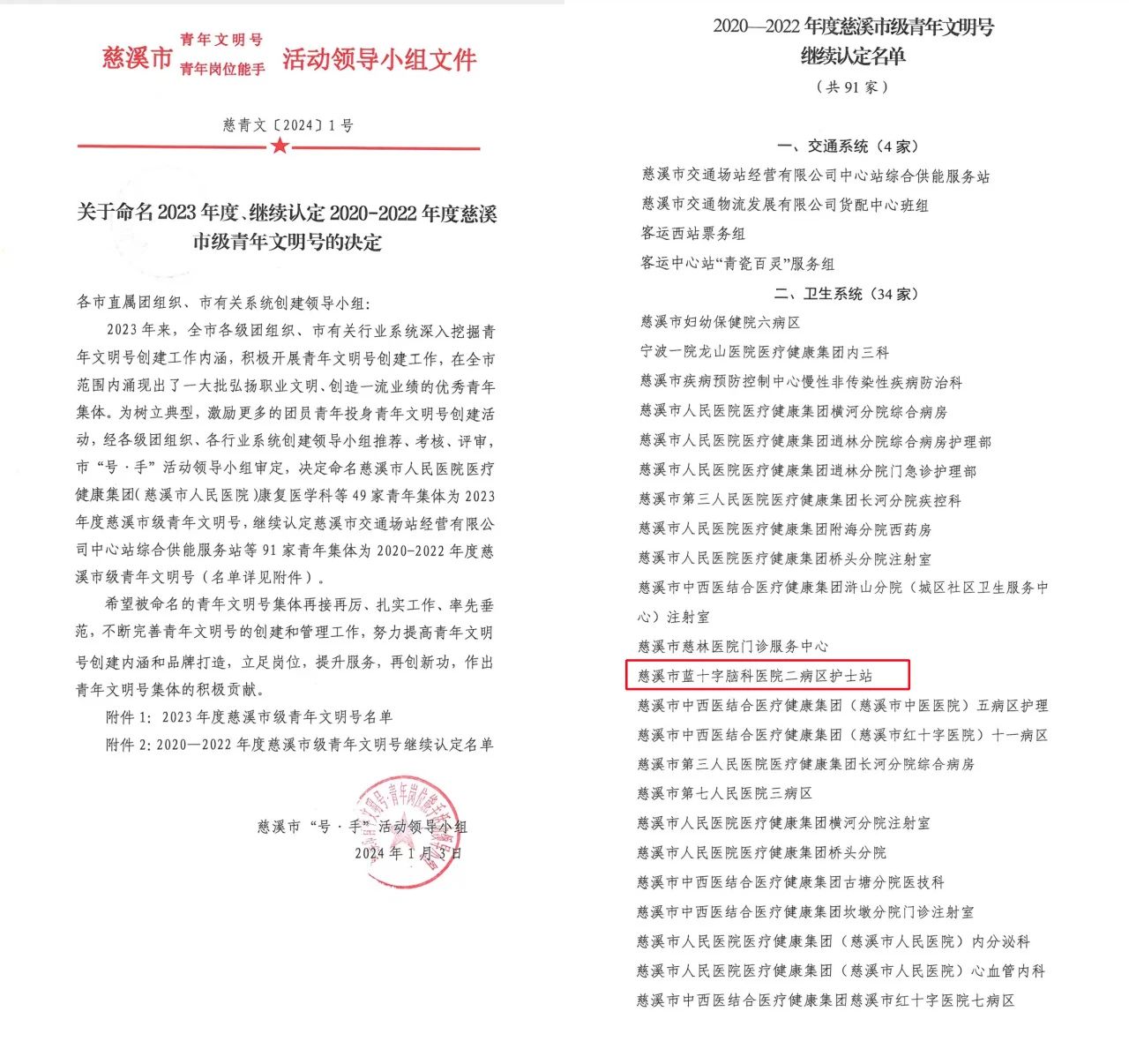 近日,慈溪市青年文明號、青年崗位能手活動領(lǐng)導(dǎo)小組印發(fā)了《關(guān)于命名2023年度、繼續(xù)認(rèn)定2020-2022年度慈溪市級青年文明號的決定》,慈溪藍(lán)十字腦科醫(yī)院二病區(qū)護(hù)士站再次被認(rèn)定為“慈溪市級青年文明號”,這是他們連續(xù)四年獲此殊榮。