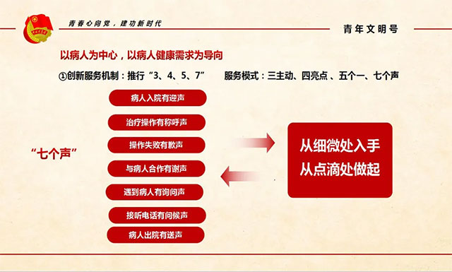 始終堅持以病人為中心,以病人健康需求為導向,創(chuàng)新服務機制,推行“3、4、5、7”的服務模式,即“三主動、四亮點 、五個一、七個聲”,從細微處入手,從點滴處做起,讓患者滿意,讓患者感動。