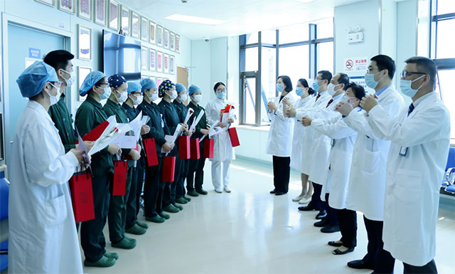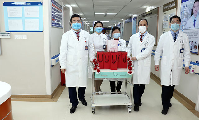 院領導們首先來到神經(jīng)外科ICU慰問護理人員。在ICU門口,雙方面對面站立。院領導雙手作揖,齊聲祝福,“祝大家節(jié)日快樂”;另一面,護士們鞠躬齊聲致謝,“謝謝”二字發(fā)自肺腑,好感動啊。