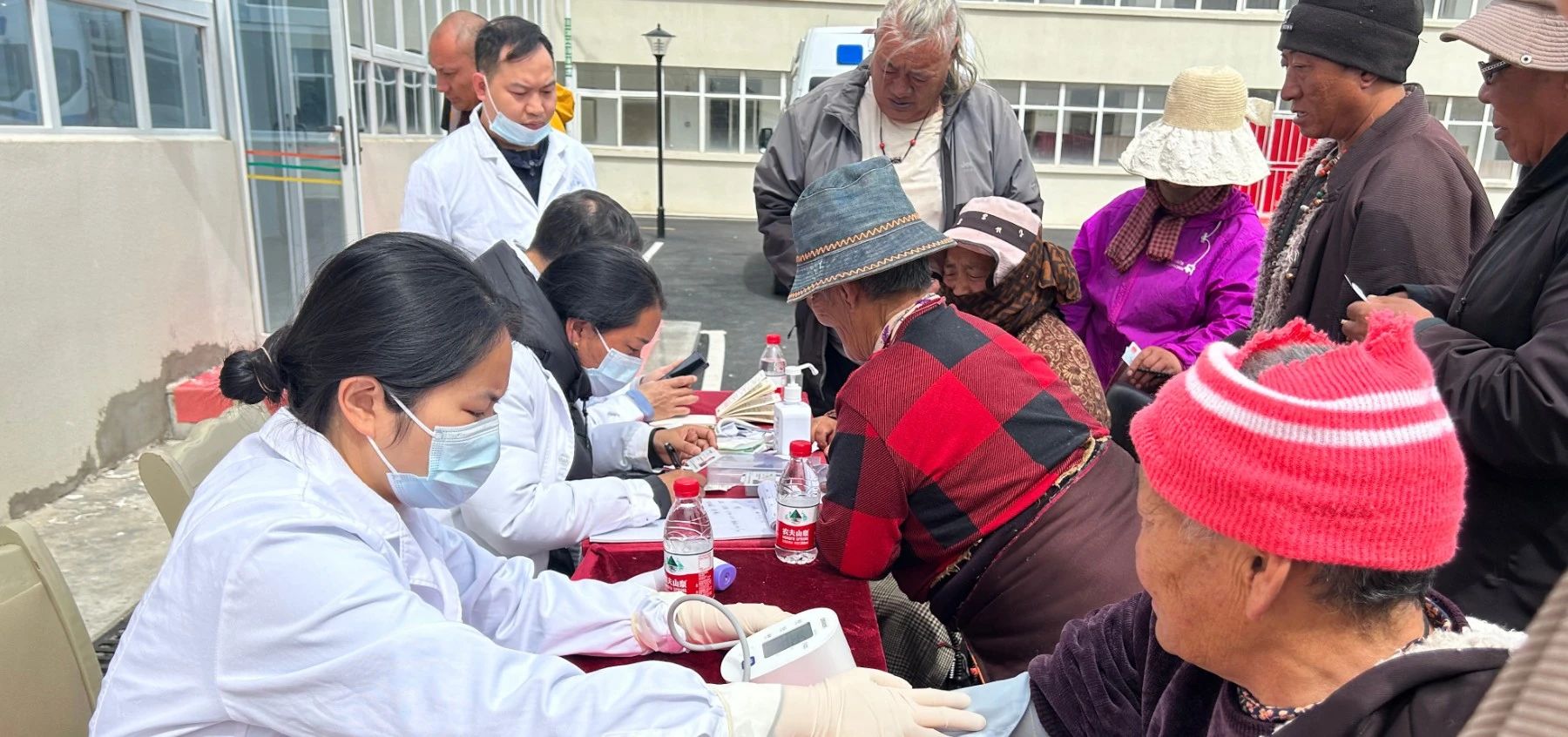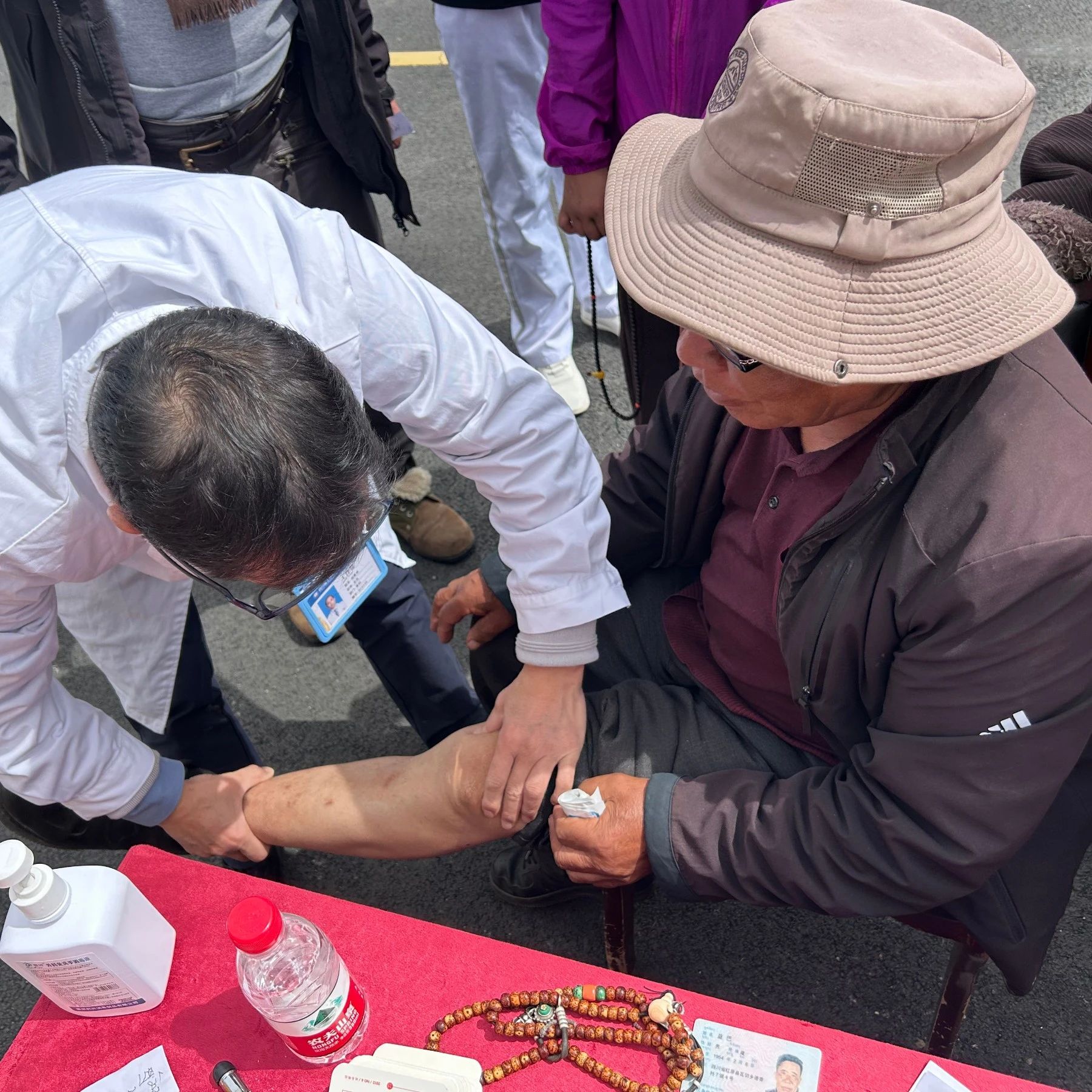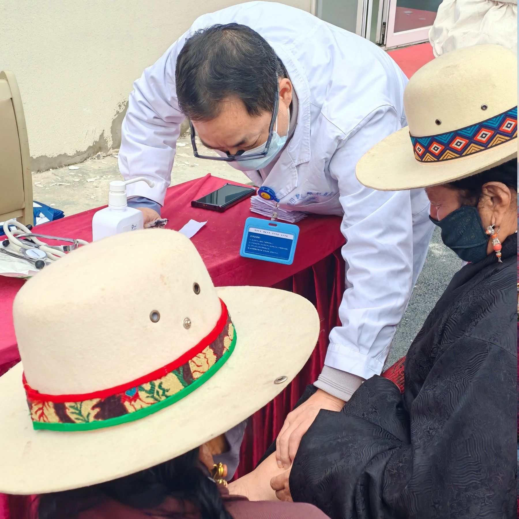 義診現(xiàn)場,段勇將主任帶領醫(yī)療小組有條不紊地開展工作。他們俯身細致檢查每一位患者的膝關節(jié)、髖關節(jié)及腰椎狀況,精準診斷疾病隱患;護士們?yōu)榫用駵y量血壓,一邊輕聲安撫緊張的老人,一邊快速記錄健康數據;藏漢雙語翻譯穿梭于人群中,用藏語輕聲傳遞醫(yī)生的專業(yè)診斷和治療建議以及“減少負重勞作”“注意關節(jié)保暖” 等醫(yī)囑,鼓勵他們樹立戰(zhàn)勝疾病的信心。