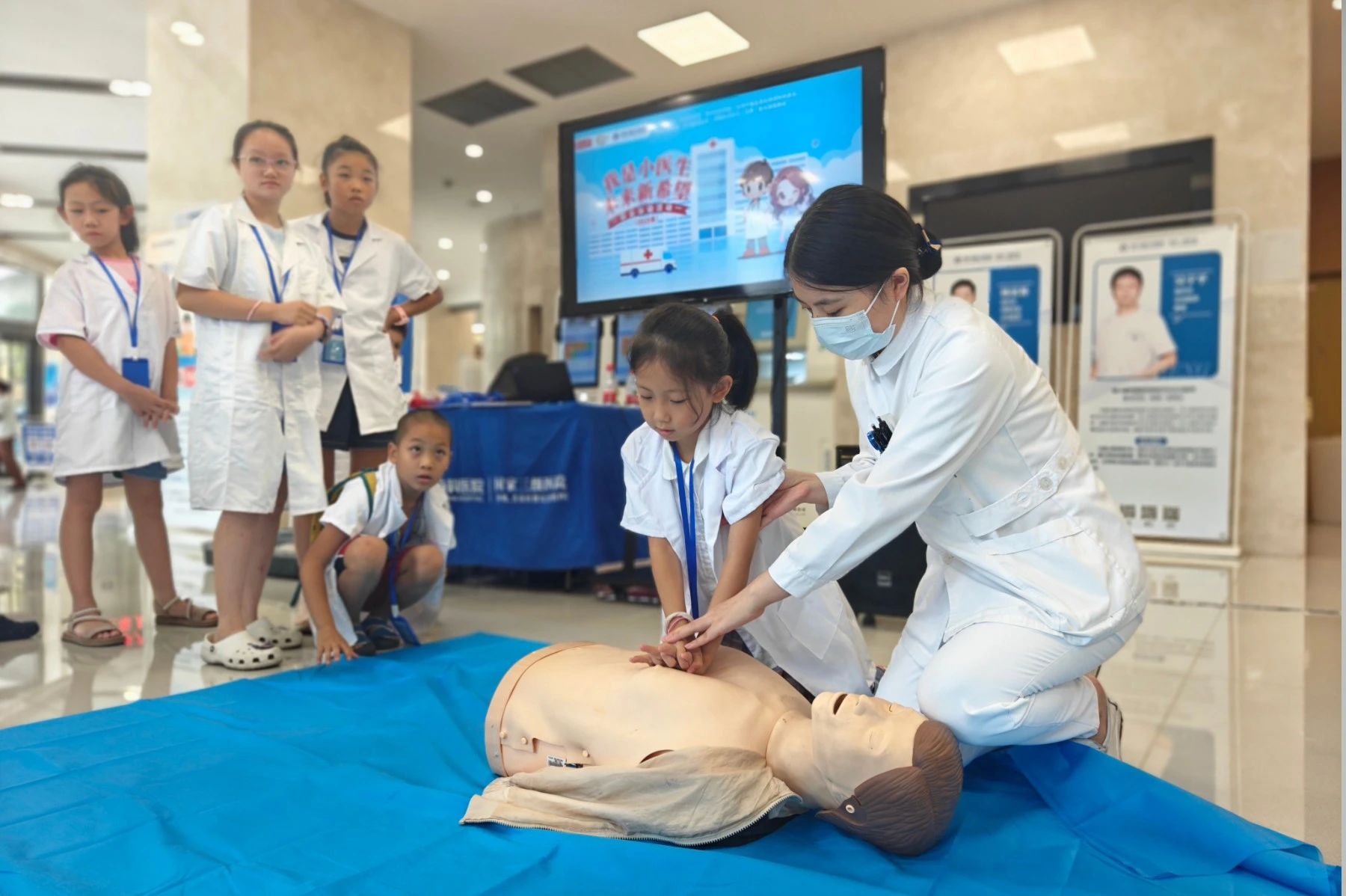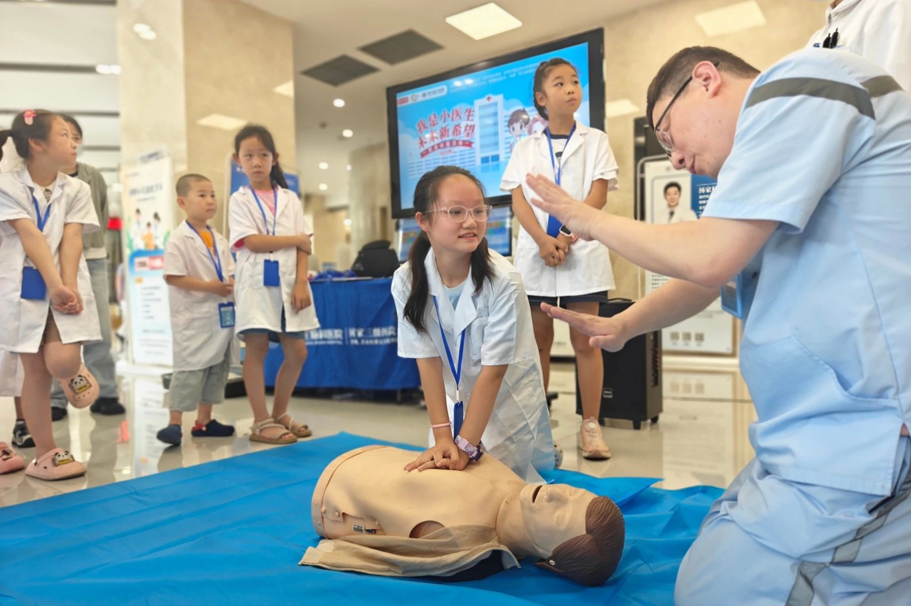 急救課堂上,急診科葉明輝主任帶來了實(shí)用的海姆立克急救法與心肺復(fù)蘇知識。在老師繪聲繪色的講解中,孩子們圍繞 “急救的奧秘”“體驗(yàn)小小急救員” 兩大主題,積極投入學(xué)習(xí)與實(shí)踐操作。通過思考與實(shí)踐的結(jié)合,他們在專業(yè)又輕松的氛圍中扎實(shí)掌握了急救技能,真正實(shí)現(xiàn)研有所得。