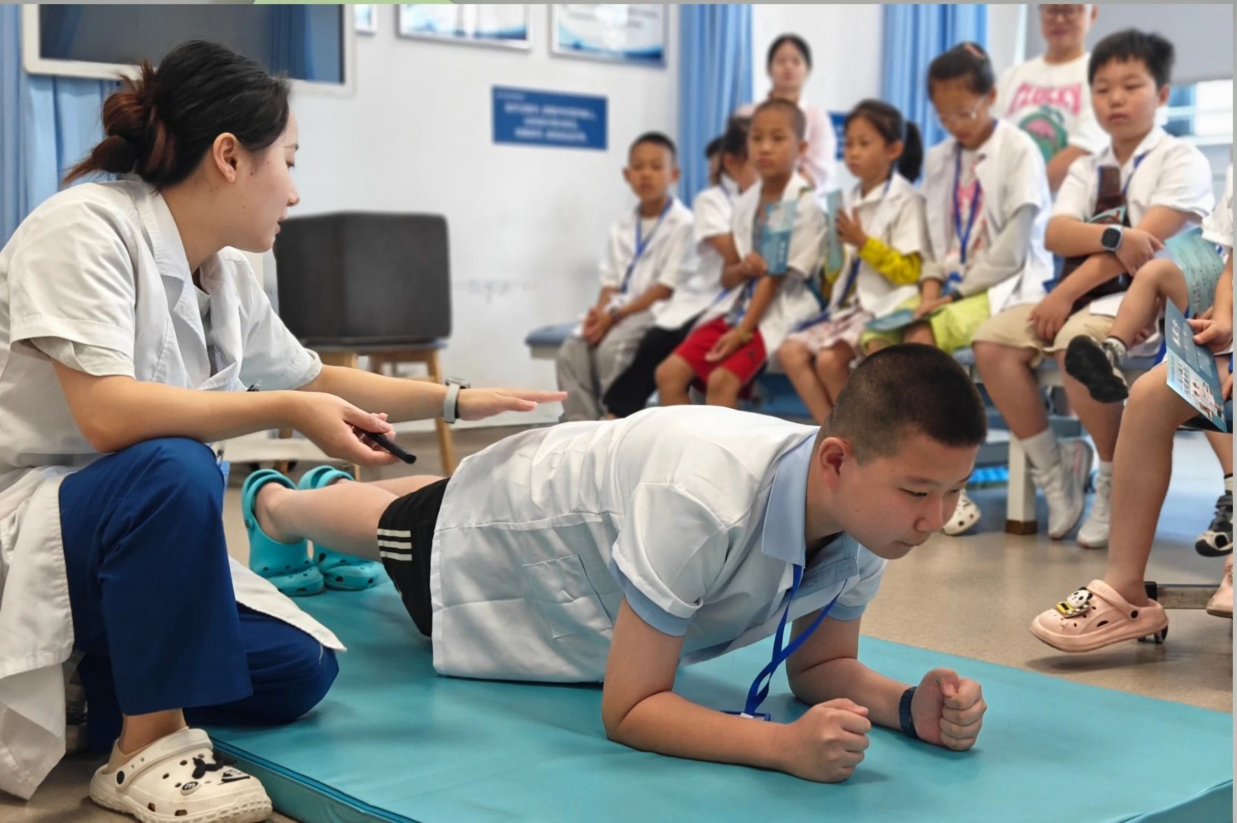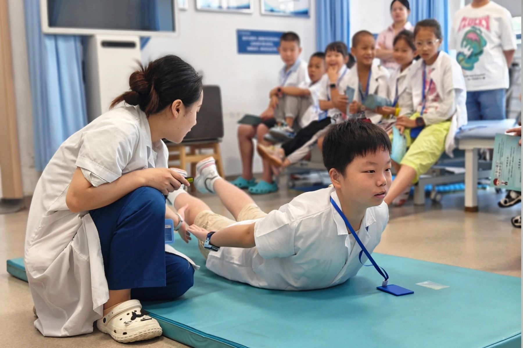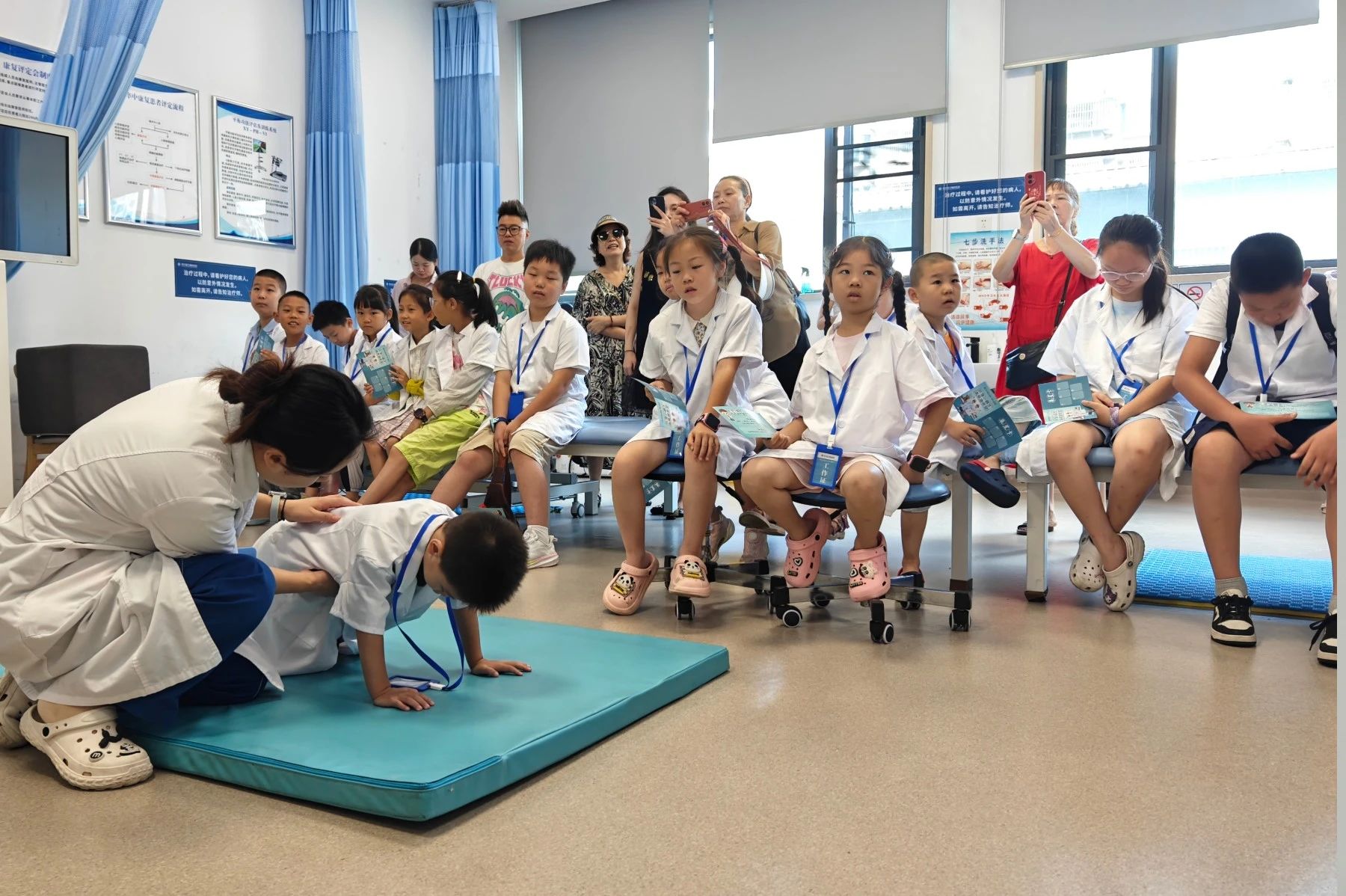 科室探索環(huán)節(jié)就像一場精彩的闖關(guān)游戲,讓孩子們在玩中學(xué),深入了解醫(yī)學(xué)知識。在康復(fù)大廳,孩子們好奇地打量著這里的一切。王玉荷老師生動(dòng)講解了康復(fù)病人的治療過程,并通過兒童肌骨骼健康互動(dòng)問答,讓孩子們在輕松交流中加深對康復(fù)醫(yī)學(xué)的理解,對醫(yī)生的敬佩之情悄然萌發(fā)。