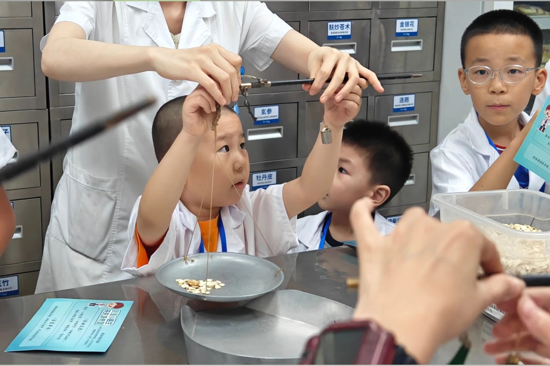 中藥房里,“中藥連連看” 和稱重體驗(yàn)讓孩子們興致高漲。杜松柏老師先引導(dǎo)大家認(rèn)識各類中藥,通過 “連連看” 游戲?qū)⑺幉呐c功效對應(yīng),既考驗(yàn)觀察力又鍛煉記憶力。隨后,兩名小朋友自告奮勇體驗(yàn)藥材稱重,專注的神情贏得了在場所有人的掌聲。