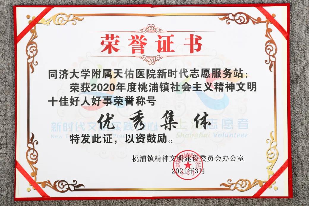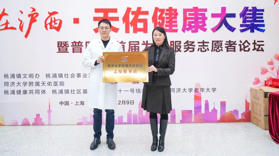 2019年12月2日,醫(yī)院被桃浦鎮(zhèn)文明辦正式授予“同濟(jì)大學(xué)附屬天佑醫(yī)院志愿服務(wù)站”,截止2020年底,天佑醫(yī)院志愿服務(wù)站共計(jì)吸納黨員志愿者22名,醫(yī)護(hù)志愿者50名。2020年開始,天佑醫(yī)院又承擔(dān)了健康桃浦1+1、健康桃浦“醫(yī)籃子”等公益項(xiàng)目,為區(qū)域內(nèi)百姓提供醫(yī)療服務(wù),樹立了良好口碑。