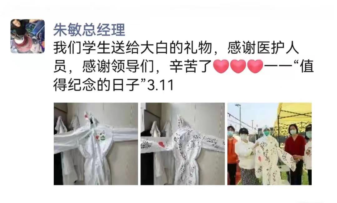 上海藍(lán)十字腦科醫(yī)院總經(jīng)理兼黨支部書記朱敏,在看到這件“禮物”時(shí)也深受觸動(dòng),第一時(shí)間配文發(fā)送到朋友圈。一個(gè)“值得紀(jì)念的日子”,鼓舞著所有在抗疫一線奮戰(zhàn)的人們。